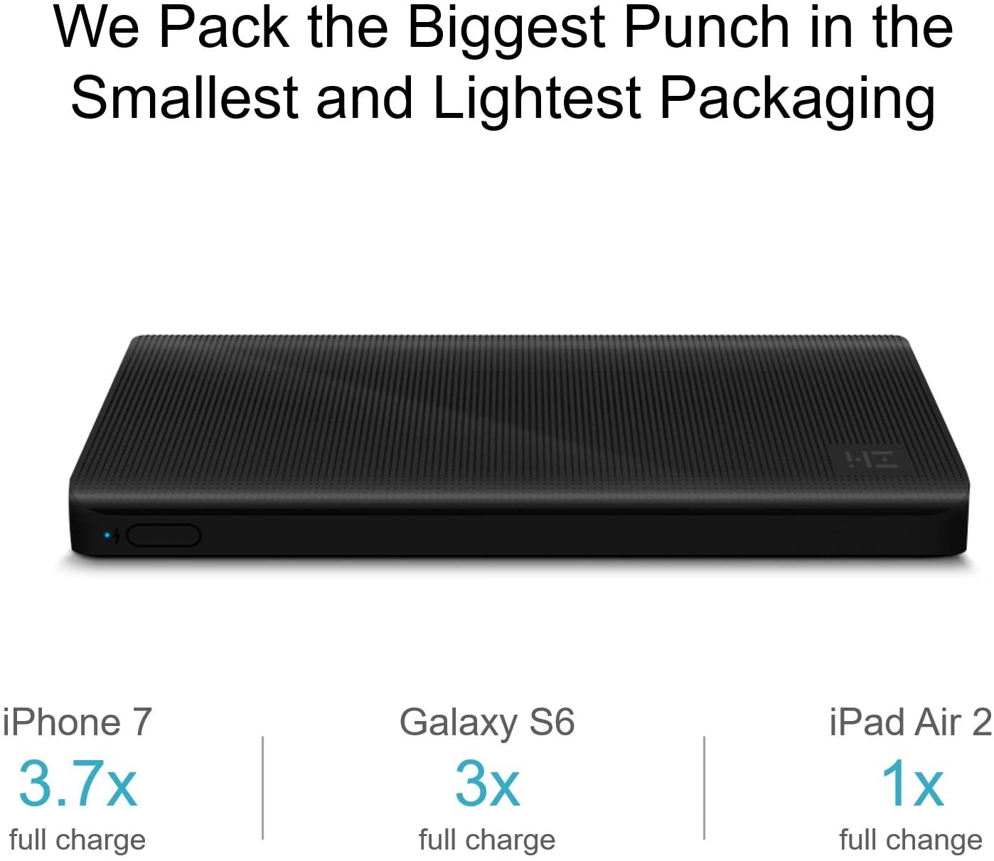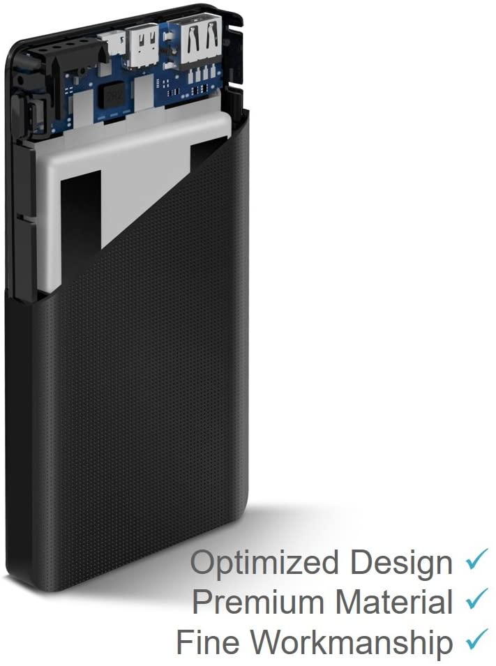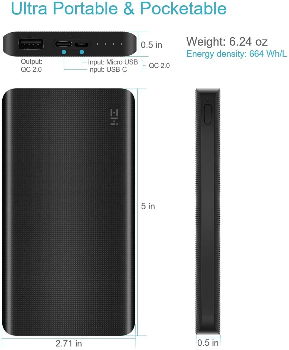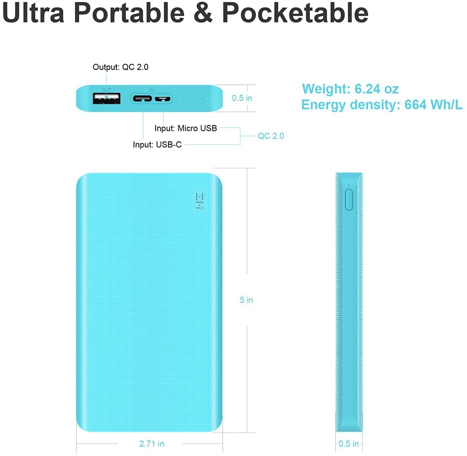 • POCKETABLE AND VERSATILE: The smallest and lightest 10000 mAh portable battery pack on the market – only 6.2 oz and 40% thinner than most 10000 mAh power banks. Perfect for your pocket or bag. Thoughtful anti-slip surface ensures a secure grip. Charges tablets, phones, connected watches, Bluetooth earphones & activity trackers via three modes: high-speed (Quick Charge 2.0), normal, and low-power. Dual input interface – fast rechargeable via Micro USB or USB-C port. USB-C port is for INPUT ONLY